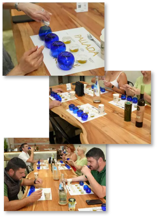 Περιλαμβάνει γευσιγνωσία 3 διαφορετικών ελαιολάδων και ξενάγηση στις εγκαταστάσεις και την εταιρία.